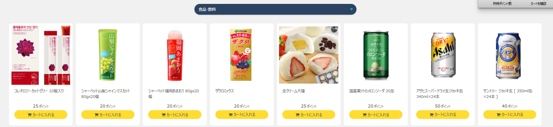 ギフト一覧ページが表示されたら、贈りたいプレゼントを選びます。「食品・飲料」から「家電」「アダルトグッズ」まで、幅広いカテゴリから探すことができます。
