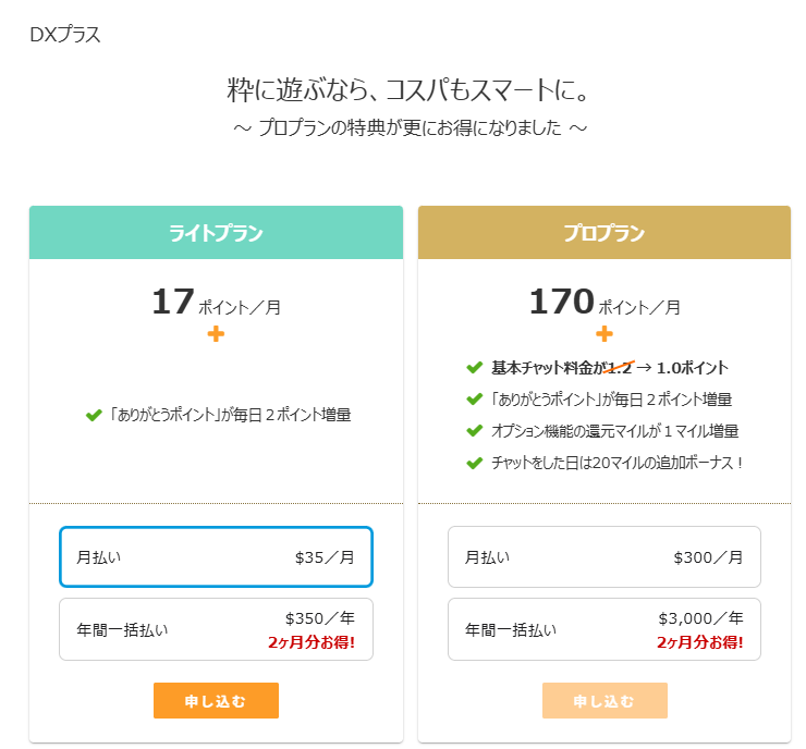 さらにそこにチャット料金の割引やマイル優遇が追加されるため、DXLIVEのヘビーユーザーは必須で入るべき超優秀プランです。
