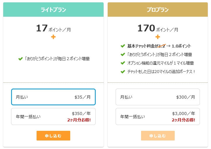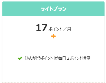 - ライトプラン(月額35ドル)は毎日のありがとうポイントが2pt増量で月60ptお得
