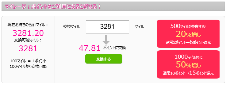 マイページ > マイレージタブからマイルをポイントに交換します。