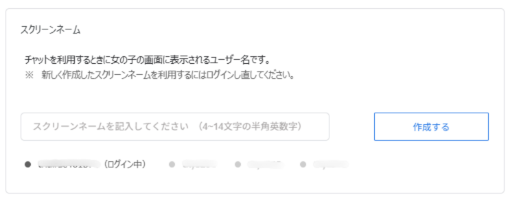 スクリーンネームは男性会員のIDにあたるものですが、DXLIVEではなぜか4つ持つことができます。かつ、各スクリーンネームごとにマイル特典を得ることができるので、今回はその仕様を利用して大量にマイルを獲得していくことになります。
