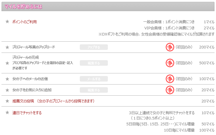 女性にメールを送ったり、お気に入り登録をするだけでも初回に限りマイルがもらえます。