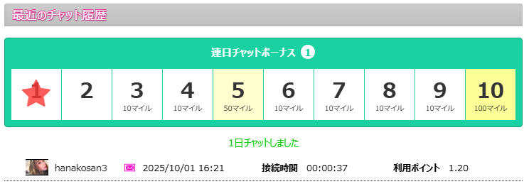 DXLIVEは連日チャットで遊ぶ(通常ポイントを0.6pt以上消費)と連続ボーナスとしてマイルが獲得できます。