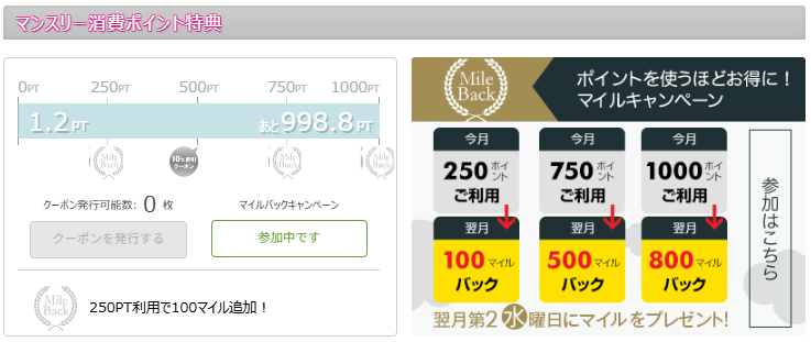 | マンスリー消費ポイント特典 | 最大800マイル | 1か月のポイント使用に応じたマイルを獲得 |